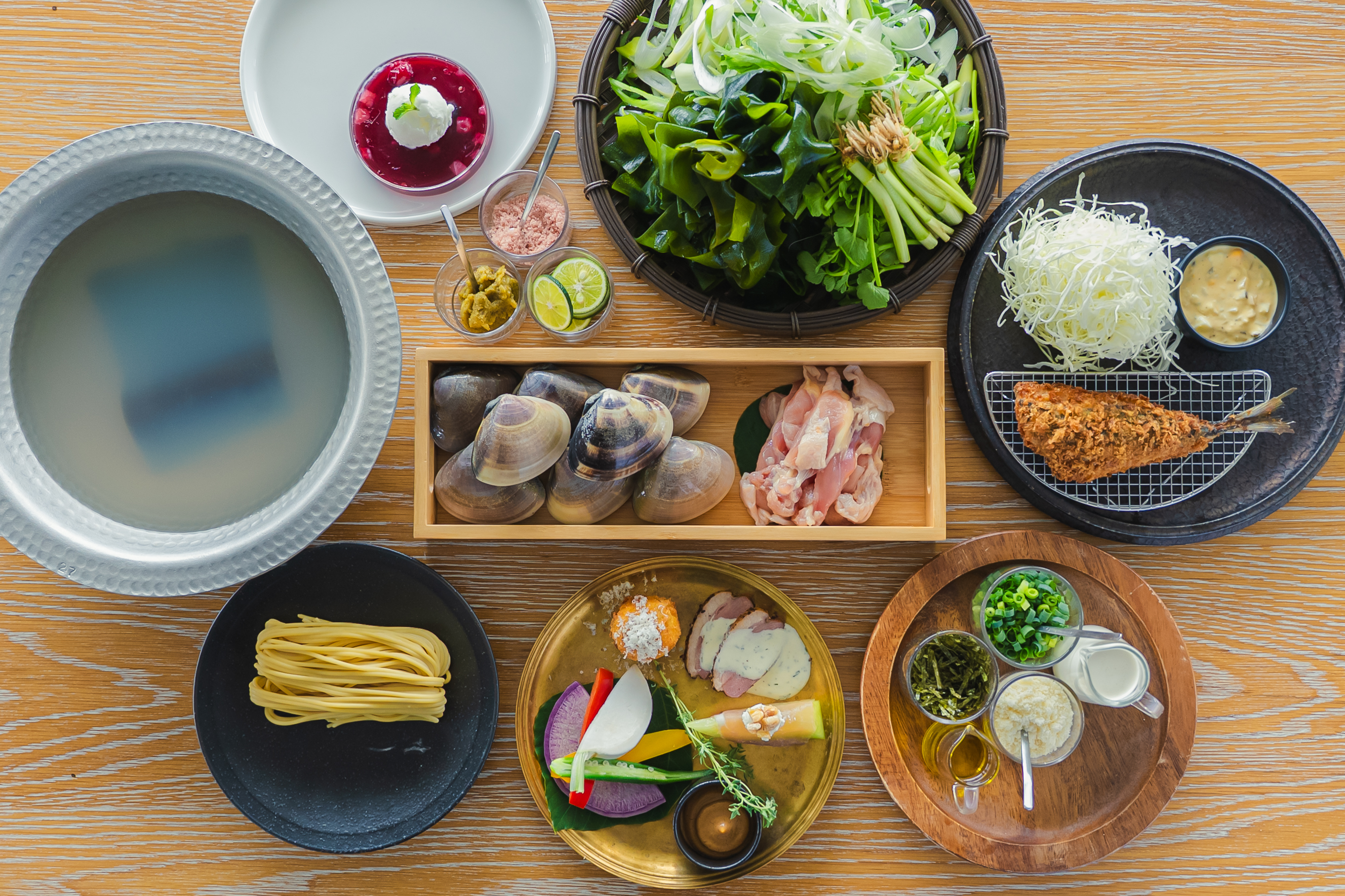 千葉名物の活ハマグリと風味豊かな生わかめを堪能できる鍋。旨味たっぷりのハマグリの出汁に新鮮なハマグリとともに生わかめをさっとくぐらせれば、程よい食感とともに素材の風味を存分に味わえます。〆には、ハマグリの旨みを生かしたクリームスープパスタをご用意。最後の一口まで余韻をお楽しみいただけます。