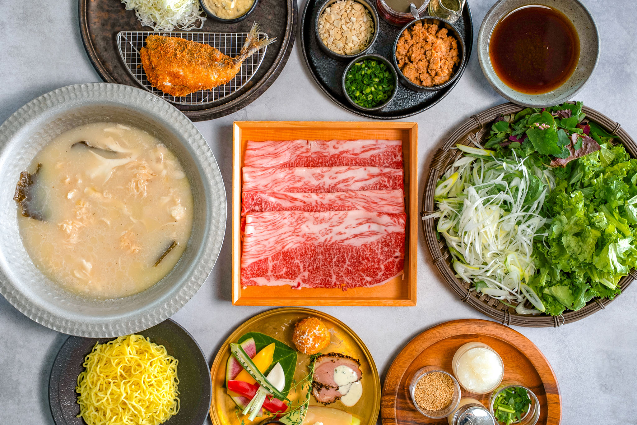 濃厚でまろやかな牛テール白湯スープに、香り豊かな10種のオーガニックハーブを合わせた身体に優しいしゃぶしゃぶ。ケールや長ネギ、キノコなど季節の野菜とともに、とろけるような木更津牛A5肩ロースをお楽しみいただけます。旨みが凝縮されたスープの〆には、コク深い白湯ラーメンを。
