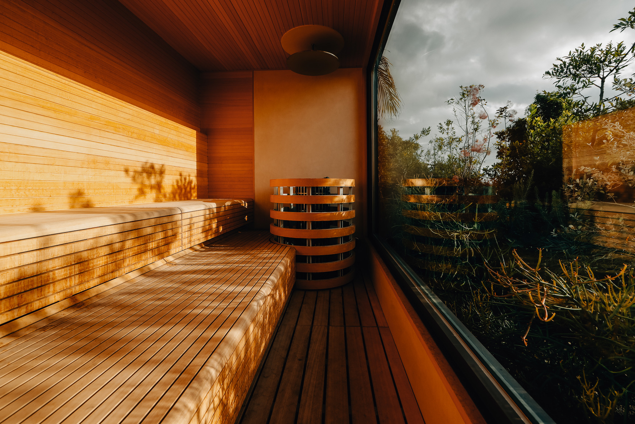 プールサイドに設置されたBOXサウナ。全面ガラス張りの大きな窓からボタニカルビューを楽しめます。サウナの後は、チラーで冷やされた冷水シャワーを浴びてプールにダイブするのもBPCならではの楽しみ方。