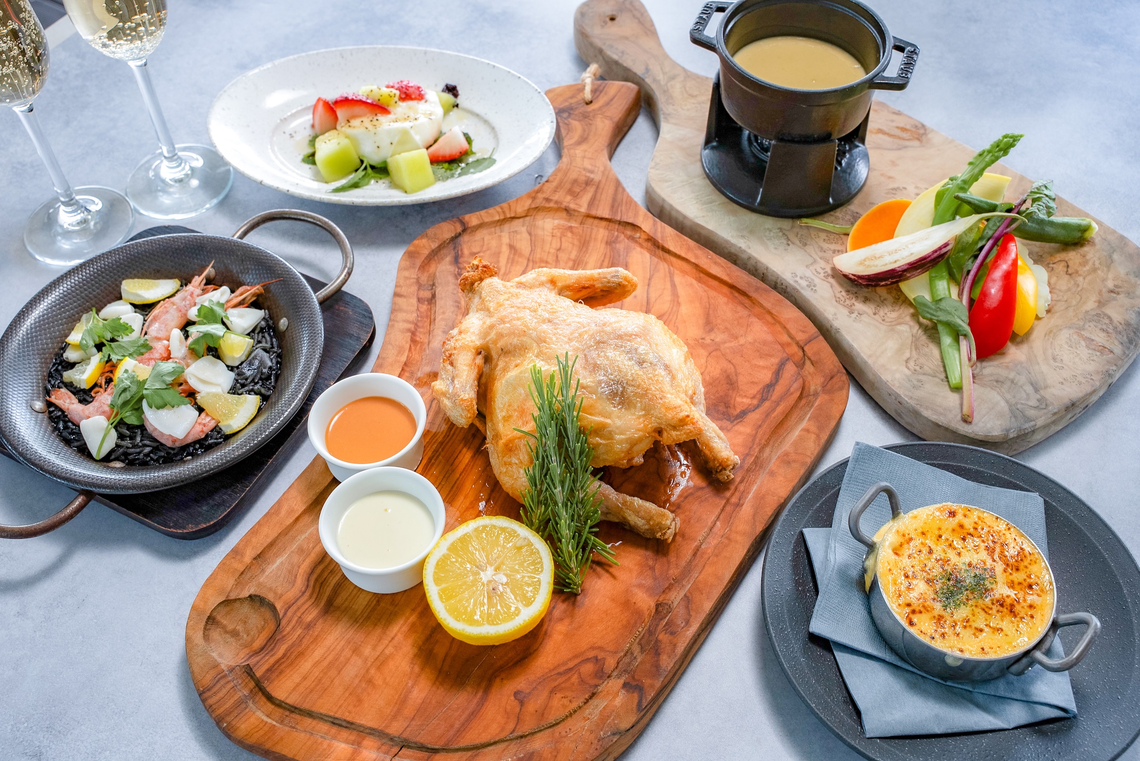 ジューシーに仕上げたチキンまたはリブアイステーキをメインに前菜からデザートまで6品で構成したスペシャルコース。コースの締めくくりには、魚介の旨味を存分に味わえるシーフードブラックパエリアを。千葉県産の新鮮な食材をふんだんに使った、季節限定の特別メニューです。
