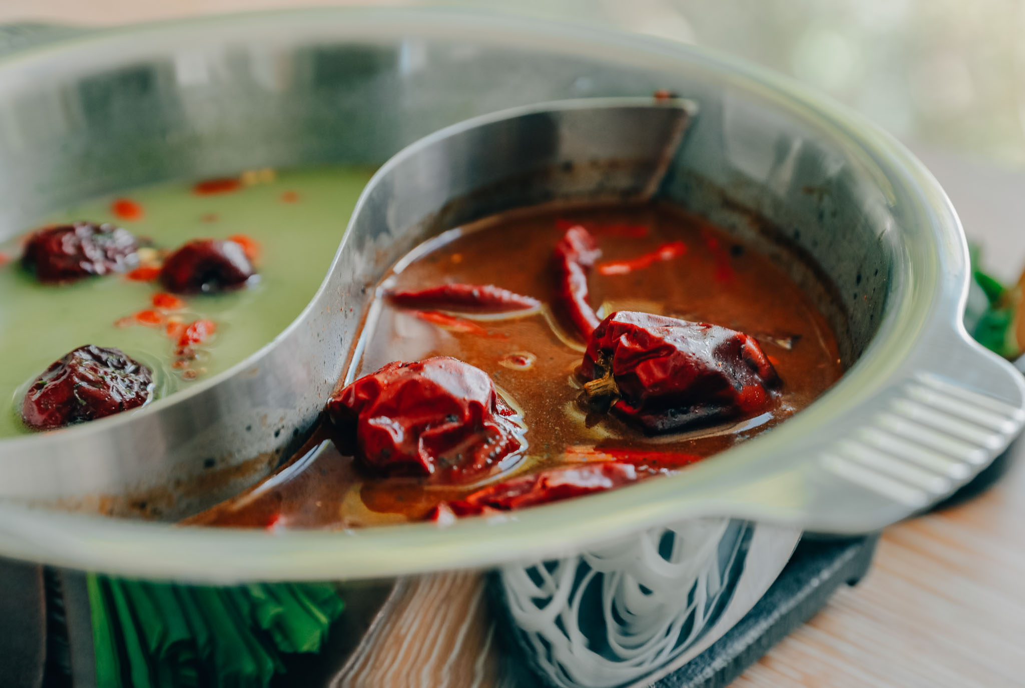 見た目にも華やかな火鍋は2種のオリジナルスープで。ボタニカルグリーンのとろり濃厚な緑白湯には、魚介の旨味たっぷりの蛤や赤エビ、千葉・鴨川のハーブ園「苗目ファーム」などから届くフレッシュなハーブを入れて、〆はジャスミンライスで薬膳粥を。ピリッと辛い黒胡麻麻辣スープでは、ラムや鶏肉、〆にはフォーをお楽しみください。