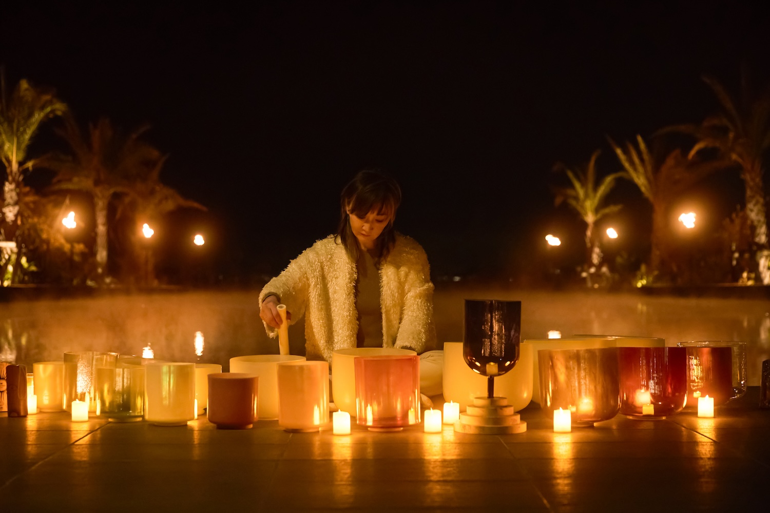 Crystal OMによるサウンドメディテーションを夜のプールサイドで体験